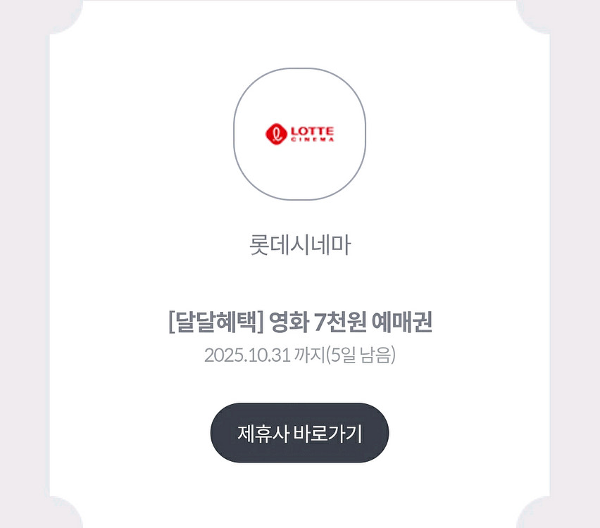 **모든제품 핀번호 노출 후 교환 연장 환불 불가** ◇ KT달달 롯데시네마 7천원 예매권 -1500원 (1매 보유) 10/31까지 ☆☆ 바로 등록하실 분 ※ 유의사항 쿠폰 발급 당월 말까지 쿠폰등록/사용(영화 관람일 기준) 필수이며 유효기간 연장 불가 롯데시네마 앱을 통해 예매 시 혜택 적용 (현장 구매 시 적용 불가) ※ 단, 특화관, 특수좌석은 추가 결제 금액 발생을 통한 예매가 가능하며, 추가금은 지점별 상이함 ※ 현장 구매 및 특별콘텐츠(GV, 시사회, 이벤트 등), 3D/샤롯데관은 혜택 적용 불가 장애인, 시니어 티켓은 대상에서 제외 롯데시네마 앱에서 예매 후 유효기간 내 취소 후 재예매 가능 영화 배급사 및 롯데시네마 사정에 따라 사전 안내없이 특정 티켓의 예매가 제한될 수 있음 타 쿠폰, 할인 서비스와 중복 할인 불가 **모든제품 핀번호 노출 후 교환 연장 환불 불가**