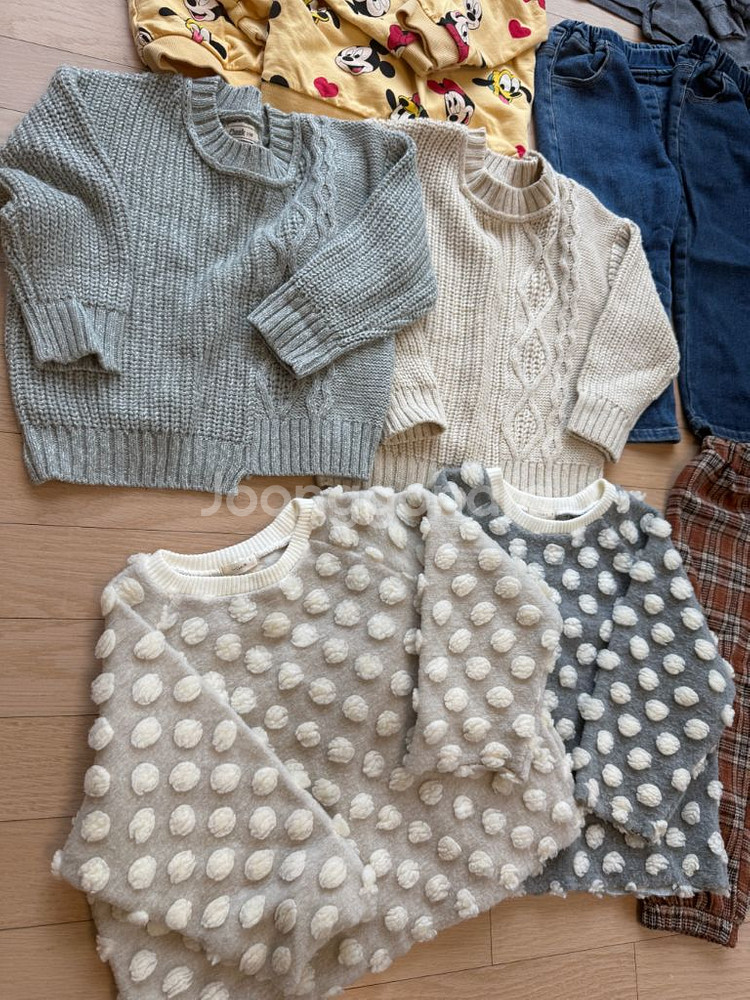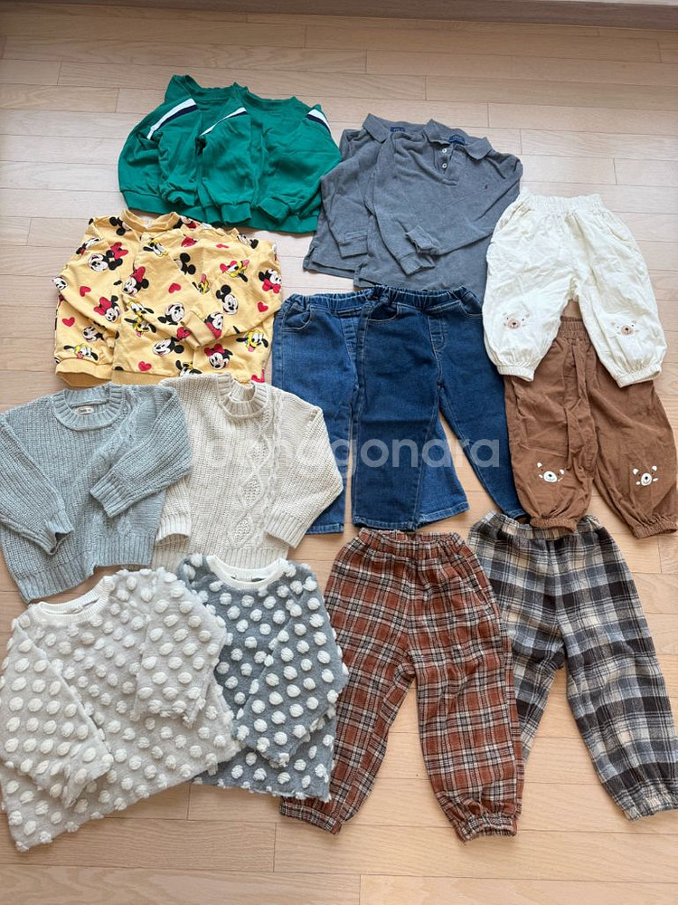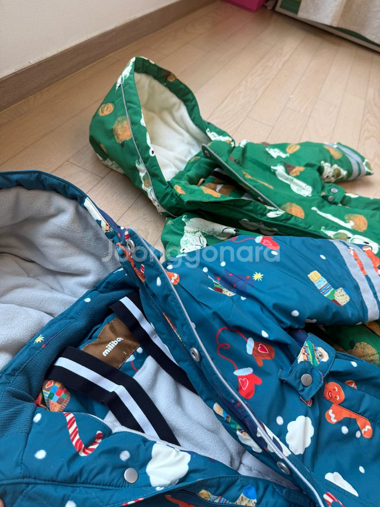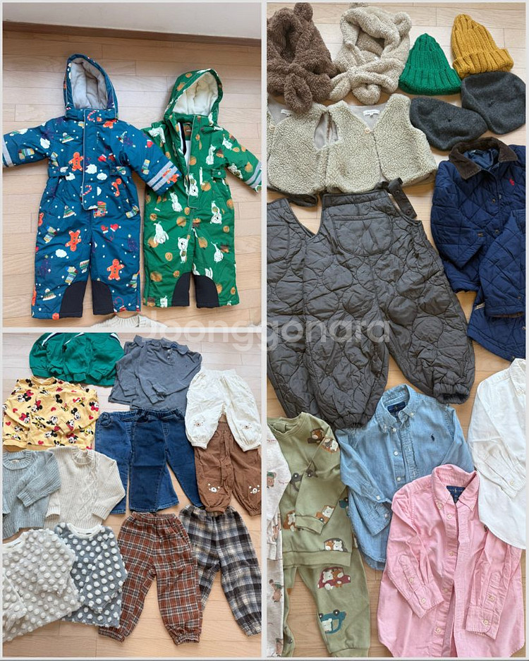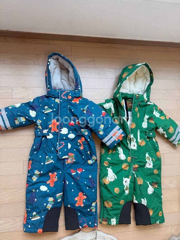 사진에 함께 찍은 묶음으로 나눠서 판매해요! 사이즈 100-110 1. 일체형 스키복 2 / 완료 2. (왼쪽아래) 가을겨울상하의 16점 / 7만원 3. 가을겨울 모자상하의 17점 / 10만원 모두 넘 귀엽습니다♡