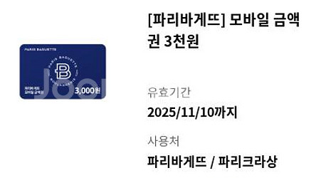 파리바게트 3000원권 2600원에 팝니다. 파리바게트 온라인 바코드 전송입니다. 3000원권 2600원에 팔구요 이용기한은 2025년11월10일까지입니다. 구매하실분은 연락주세요. 연락처:010-②⑧⑥⑥-0⑨⑧⑦