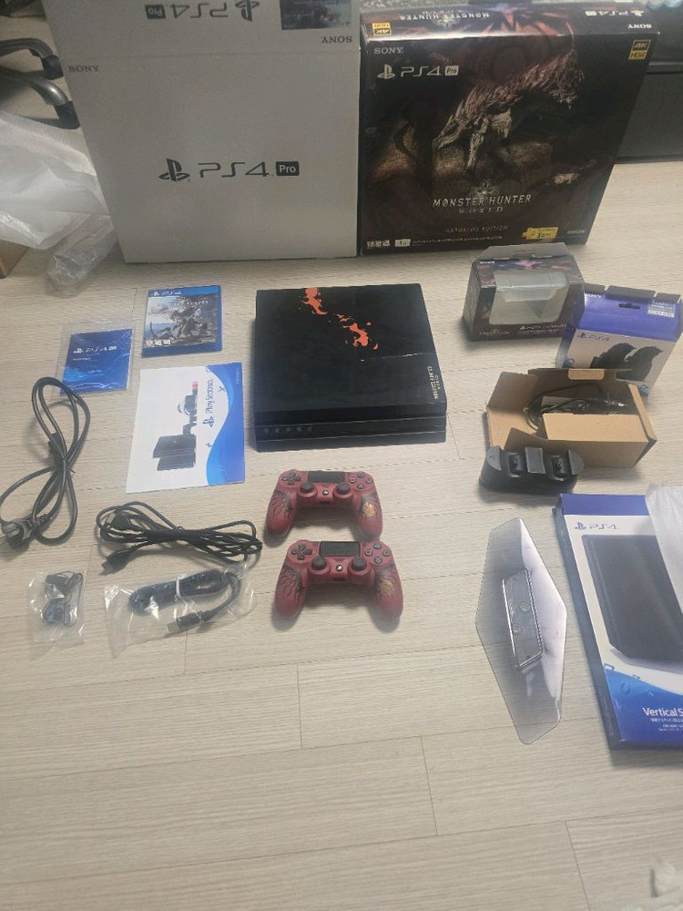 플스4 프로 1TB 리오레우스 한정판 CD포함 박스 풀셋에 추가 리오레우스 듀얼쇼크 및 듀얼 충전기, 수직 스탠드 모두 정품 판매합니다. 스탠드, 이어폰, 충전 케이블은 사용조차 안했고 특전은 사용했습니다. 초기화 해두었으며 직, 택배거래 가능