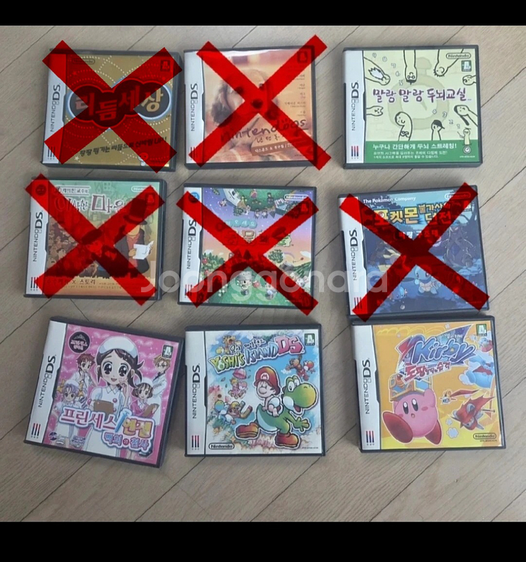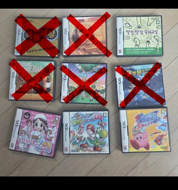 닌텐도 DS 게임 9개 - 리듬 세상 : 15만원 (판매완료) - Nintendogs 닥스훈트&친구들 : 3만원 (판매완료) - 말랑말랑 두뇌교실 : 1만원 - 레이튼교수와 이상한 마을 : 45.000원 (판매완료) - 동물의 숲 : 10만원 (판매완료) - 포켓몬 불가사의 던전 : 8만원 (판매완료) - 프린세스 엔젤 : 15만원 - 요시 아일랜드 DS 한글판 : 2만원 - 요시 아일랜드 DS 일본판 : 2만원 (칩만 드림) - 별의 커비 도팡일당의 습격 : 8만원 모두 한글판. 거의안씀 (요시아일랜드만 한글판 1개 / 일본판 1개 각각 있음) 다 설명서+케이스 동봉임