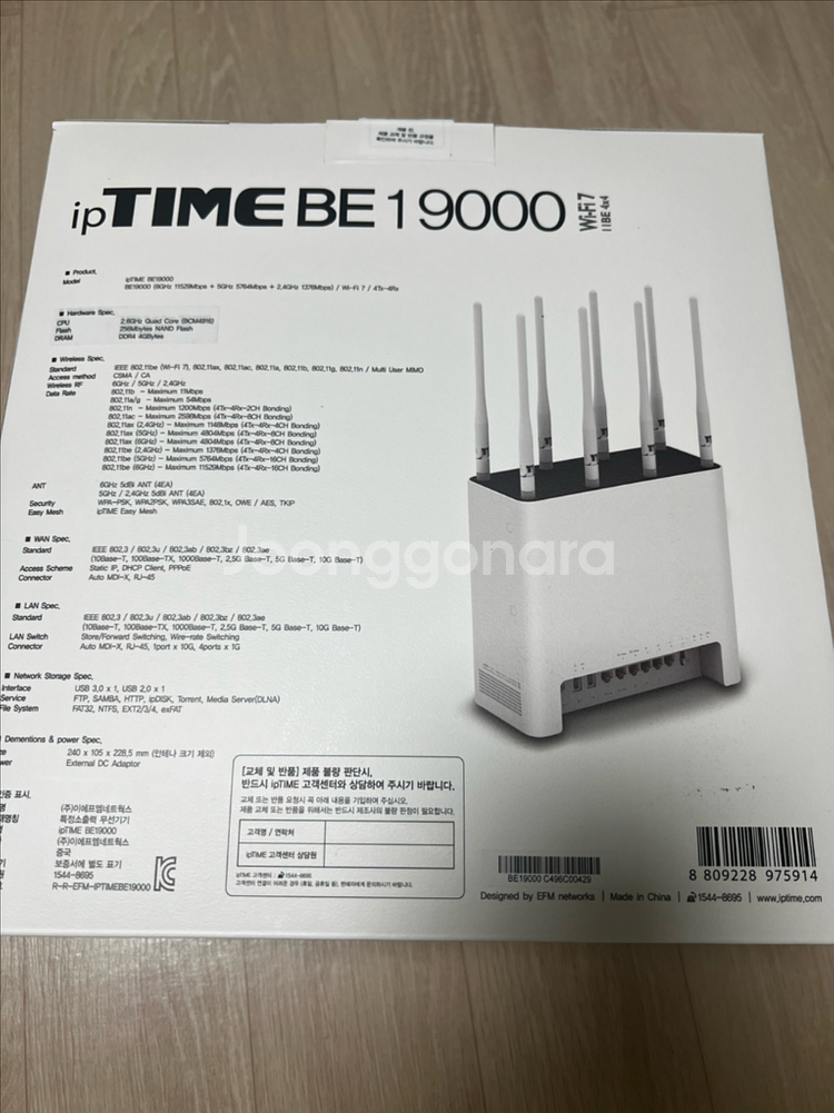 EFM네트웍스 아이피타임 BE19000 최대무선속도 : BE19000유선속도 : 10Gbps안테나개수 : 8개무선랜 : 무선랜be(와이파이7)USB포트 : 2개포트수 : 4포트부가기능 개봉은 했지만 미사용제품입니다 판매가 380000원 직거래는 7호선 철산역입니다!