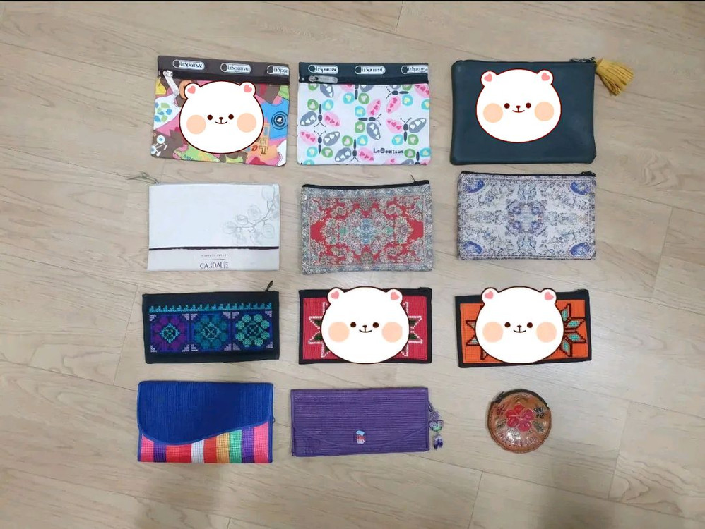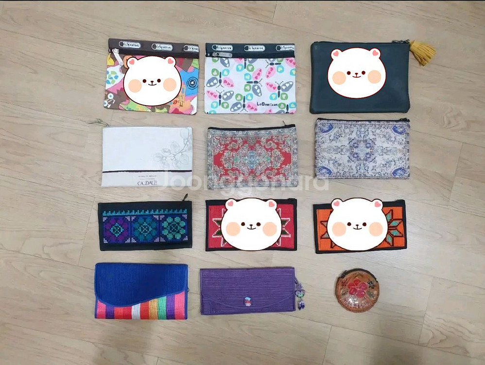 자세한 사이즈는 사진에 있습니다 첫줄 1.판매완료 2.레스포색파우치-정품,새상품 8000원씩 3.회색파우치-판매완료 둘째줄 1.아이보리색-새상품 1000원 2~3.새상품 하나에 2500원씩 셋째줄 1.천지폐지갑블랙-몇번사용해서 테두리에 사용감있습니다 전체적으로는 깨끗함 1000원 2.3 판매완료 넷째줄 1.무지개지폐지갑-새상품이나 파랑색 왼쪽부분에 얼룩하나있습니다 1500원 2.보라색지폐지갑-2000원 3.가죽동전지갑-2000원
