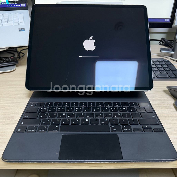 아이패드 프로 12.9 5세대 셀룰러 256GB 입니다 패드 본품만의 가격입니다 매직키보드/펜슬 서비스로 드리는 겁니다 키보드, 펜슬의 이상 혹은 필요 없다해서 네고가 되지 않습니다 아이패드 - 배터리 효율 82~83% - 외관 데미지 없음(잘 안보이는 얼룩 있을 수 있음) - 액정 기스1개 있음. 화면켜면 안보임 *사진 참고 - 충전기 없음, 케이블 있음, 박스없음 매직키보드 (서비스로 드리는 제품) - 사용감 많음 - 정상 작동 - 펼치고 닫을때 딱딱 소리남 - 찍힘 다수 - 사용감 많음 애플펜슬 - 사용감 있음 - 정상 작동 - 펜촉 새걸로 교체 상태 슈피겐보호 케이스 - 키보드에 바로 붙일 수 있는 슬림케이스 - 장착하고도 키보드 쓸수 있고 펜슬 보호 및 이탈 방지됨