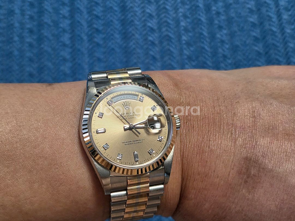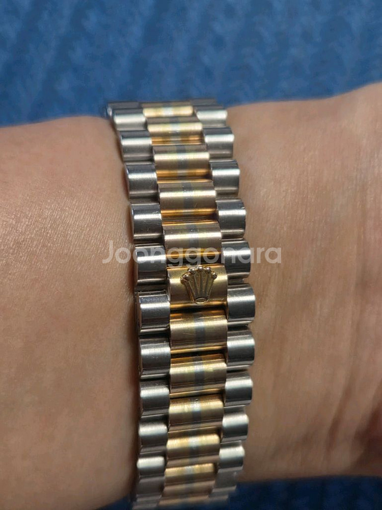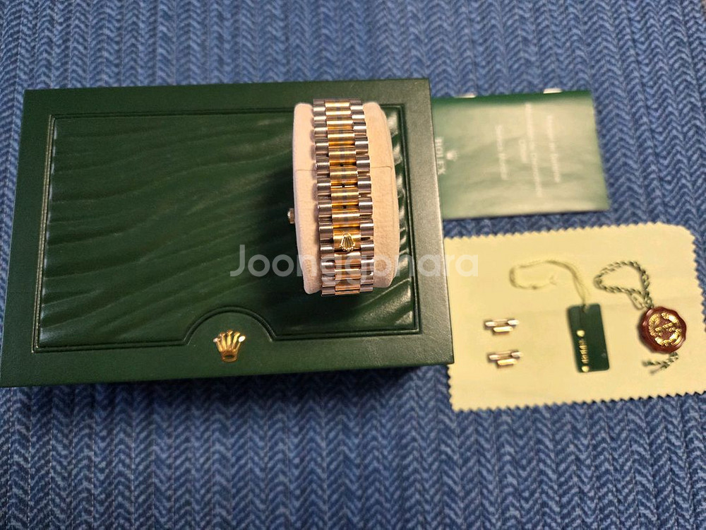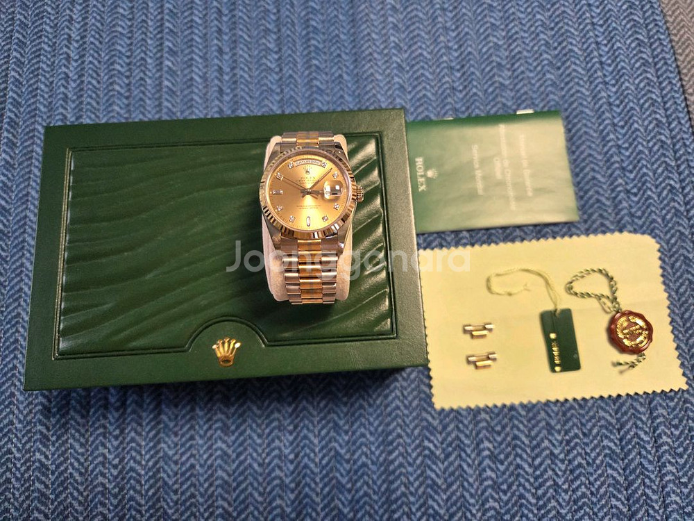 Rolex Day-Date 18239B 18K 통골드 45돈 풀세트 판매합니다. • 브랜드: Rolex • 모델: Day-Date 18239B (18K 옐로우 골드) • 구입년도: 2001년 미국 정식 매장 • 금중량: 45돈 (통줄 / 신형과 중량 동일) • 상태: 자연스러운 사용감,기스 있습니다. • 오버홀: 2025년 여름 완료 • 오차: 하루 1초 미만 • 구성품: 박스, 보증서, 태그, 여분 링크 2개, 융 (풀세트) 국내 동일 조건 매물 찾기 어렵습니다. 동일 제품기준 상태 최상급, 정품 100% 보장. 서울 / 춘천 직거래 우선 (감정 가능) 희망가: 0,000만 원 (합리적 네고 가능)