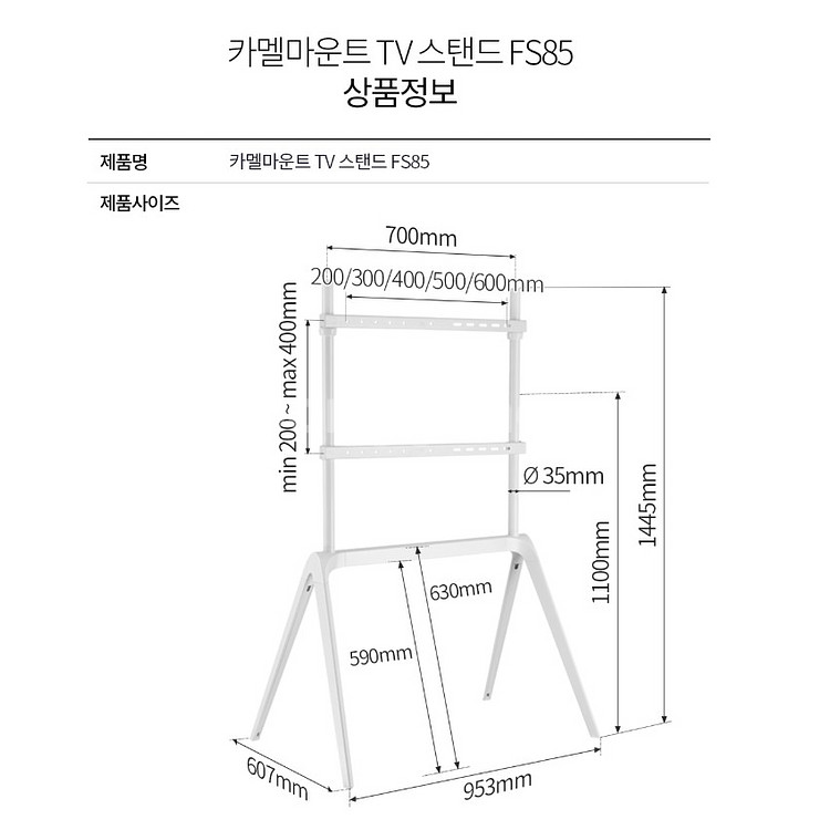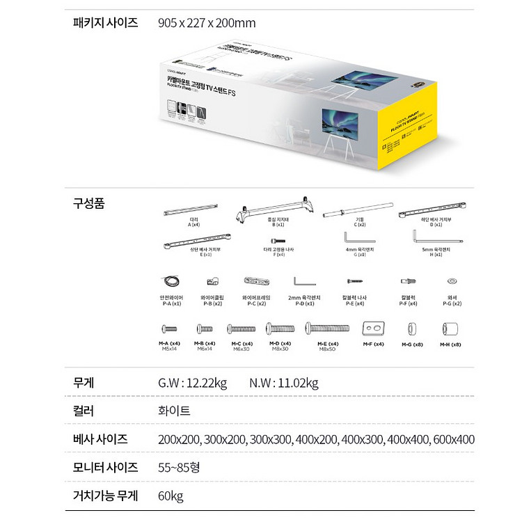 카멜마운트 FS85 카멜마운트 FS85 대형 TV 거치대 단순 개봉 미사용 제품입니다. 거치 가능 사이즈 : 55~85인치 거치 가능 무게 : 최대 60kg 운송비 포함 75,000원 연락주세요.