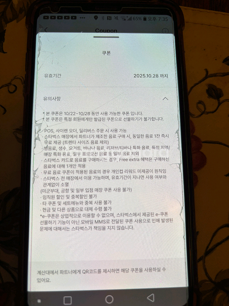 스타벅스에서 28일까지 사용가능합니다. 대부분 음료에 적용가능하구요(사진 참고) 입금주시면 앱채팅으로 qr코드 보내드려요. qr코드를 실시간으로 보내드려야해서(사이렌오더 불가능) 빨리 사용 가능하신분에게 판매하고싶어요