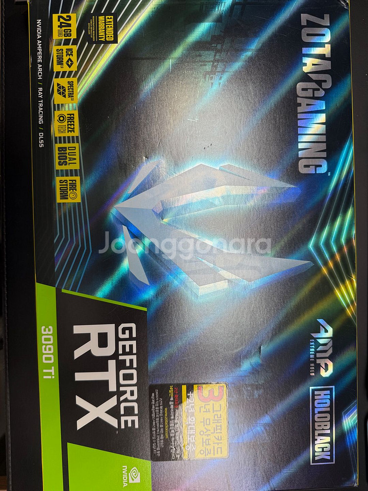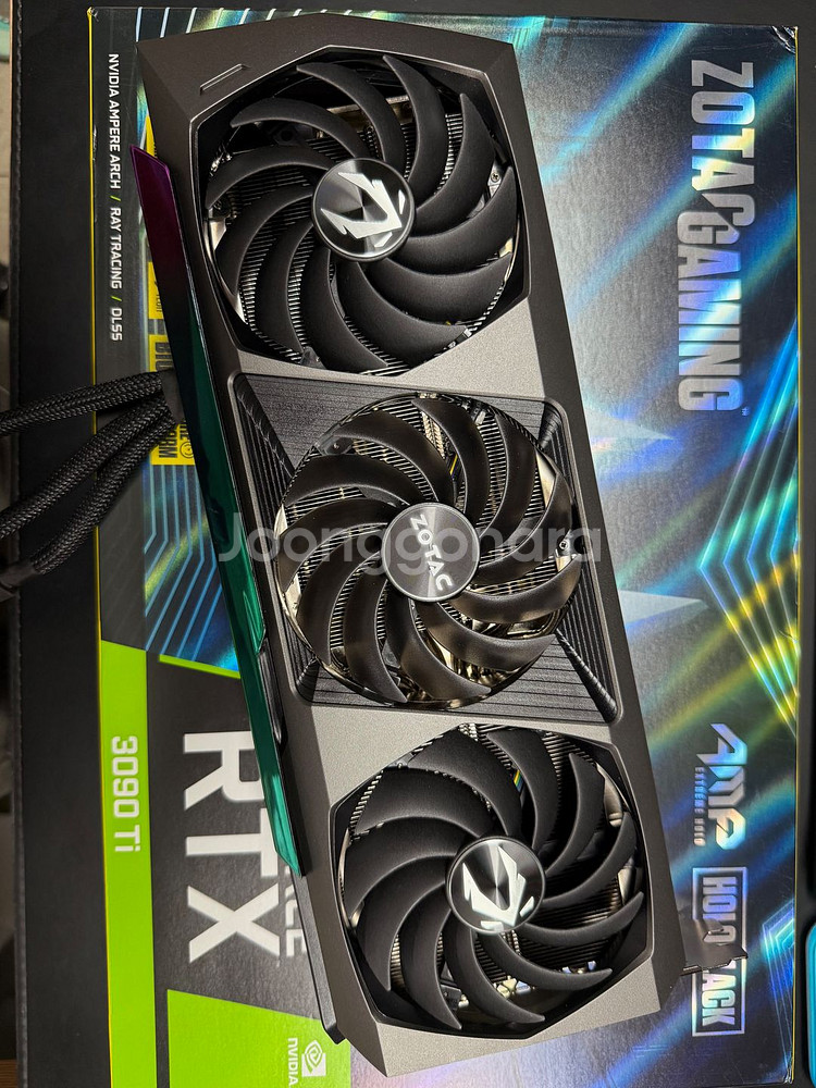 ZOTAC RTX 3090 Ti HOLOBLACK 조탁 3090 Ti입니다. 시리얼번호기준 제조일자 22년 12월 입니다. 비닐까지 있는 풀박스 상태이고, 상태 s급 자부합니다. (3달 사용하고 게임을 못하게 되어 다시 넣어둠 ㅠ..) 상태대비 정말 싸게 팝니다. 대전 직거래 하고 싶고, 혹시라도 택배원하시면 최대한 꼼꼼하게 포장해드릴 순 있으나,, 파손이 걱정이네요 감사합니다.