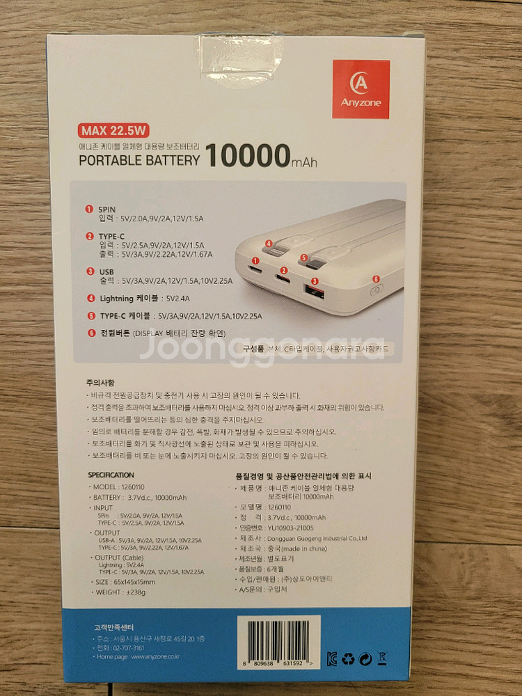 [미개봉] 애니존 케이블 일체형 MAX 22.5W 보조배터리 10000mAh (1260110)를 직거래 기준으로 13,000원에 팝니다. <직거래>는 (대중교통으로 오실 경우) 서울시 구로구 개봉역(1호선), 금천구 가산디지탈단지역(1,7호선), 경기도 광명사거리역(7호선) 인근 및 (차로 오실 경우) 서울시 구로구 개봉동 **아파트 입구 입니다. (단, 직거래는 사전에 시간과 장소가 서로 협의된 경우에 한정합니다. 주말 혹은 심야시간대는 직거래가 어려울 수 있어서 그럽니다.) <택배>는 편의점 CU/GS25편의점 반값택배-(서울/인천/경기-2,000원, 그외-2,500원) 일반택배-(서울/인천 /경기-3,500원, 그외-4,500원) 각각 별도이며, 초과되는 금액은 제가 내드립니다~^^ (*단, 도서/산간지역은 착불이거나 별도 협의 입니다.)