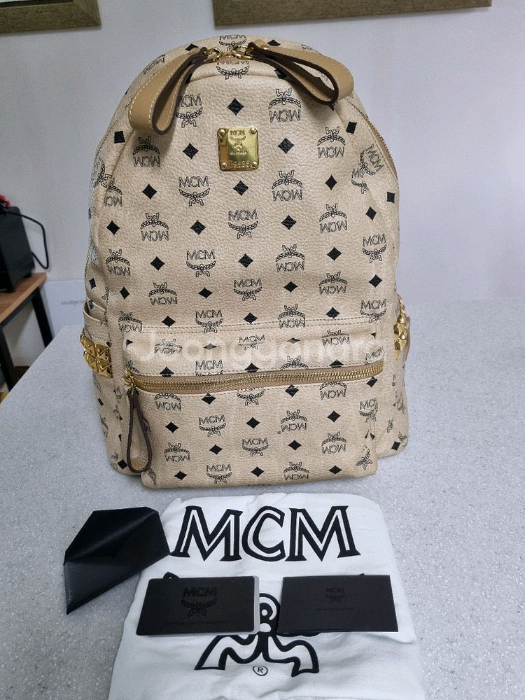엠씨엠 스타크 사이드 스터드 비세토스 베이지색상 백팩입니다. 정품입니다. 남녀공용으로 사용가능합니다. 34×44×18 정도 크기입니다. 노트북 충분히 들어가고 뒷편에 넣는곳도 따로 있어요. 실사용한게 해외여행갔을때 두번 사용한게 전부라서 로고.지퍼. 스터드장식부분 금장벗겨짐 없고 헤짐.닳음 전혀 없습니다. 사진으로 확인해주세요. 인천공항 면세점에서 구입한지는 좀 됐지만 실사용이 두세번정도 밖에 안되는 가방이라 상태는 최상입니다.