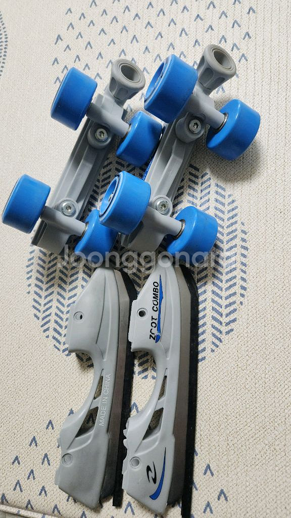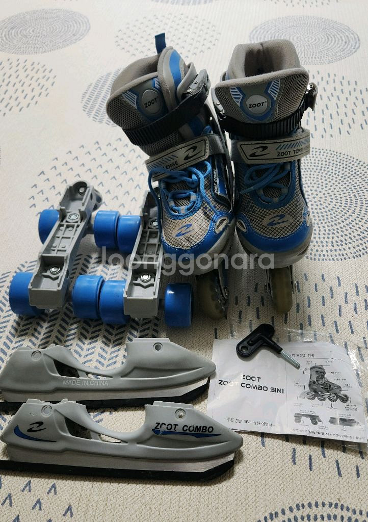ZOOT 인라인스케이트 3종 세트와 보호구입니다 옆부분 버튼으로 190-215mm 사이즈 변환되며 인라인스케이트로 세팅되어 있으며 첨부된 기구로 빙상장에 탈수 있는 아이스 스케이트와 롤러스케이트로 변환되어 매우 유용합니다 사용감은 있으나 전체적으로 깨끗하게 잘 사용했습니다 바디 보호장구 세트와 헬멧 포함 메뉴얼,조립기구도 같이 보내드립니다 결제하시고 받으실 장소,번호 입력하시면 바로 택배로 잘 보내드리겠습니다