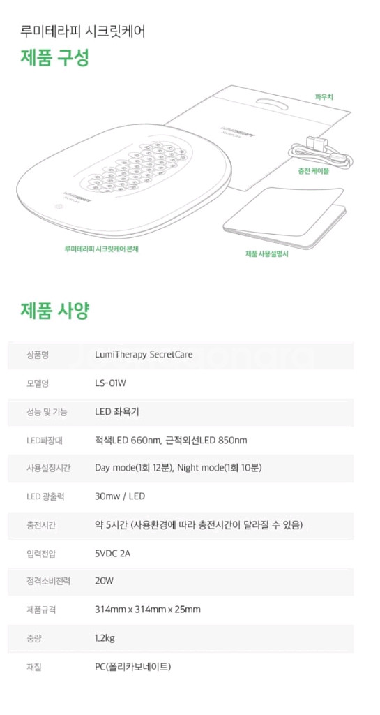 루미 시크릿 케어 좌욕기LS-01W - LED 광선요법 사용 - 적색 LED 660nm, 근적외선 LED 850nm - 사이즈: 314 x 314 x 25mm - 무게: 1.2kg - 재질: PC (폴리카보네이트) 언제 어디서든 사용 가능합니다
