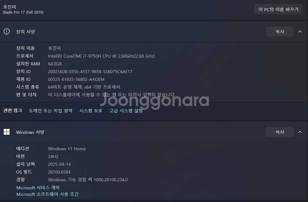 💻 레이저 블레이드 17인치 Razer Blade 17 (RTX 2080 Max-Q / i7 / 64GB RAM / Win11) 윈도우계의 애플이라 불리는 Razer Blade 17 판매합니다. 풀 알루미늄 유니바디 바디에 고급스러운 글라스 터치패드, 게이밍/크리에이티브 작업 모두 완벽히 소화하는 프리미엄 노트북입니다. ⸻ 🔧 주요 스펙 • CPU: Intel i7-9750H • RAM: 64GB (풀 업그레이드) • GPU: NVIDIA RTX 2080 Max-Q • SSD: Samsung NVMe 500GB • 디스플레이: FHD (1920×1080) / 240Hz 주사율 • 운영체제: Windows 11 Home 정품 설치 완료 ⸻ 🔋 관리 및 교체 내역 • 약 한 달 전 내부 배터리 교체 (새 제품) • 바이오스 배터리 교체 완료 👉 배터리 상태 최상급입니다. ⸻ 🧩 외관 상태 • 외부 전신 보호필름 부착 중(상판제외) → 상판 기스없이 깨끗합니다 • 스피커 옆 약 2mm 미세 찍힘 있음 • 키보드 S, 2키는 부팅 전 색상이 약간 다르지만 부팅 후 Razer Chroma 녹색 설정 시 정상 작동합니다. 전체적으로 관리 잘 된 깔끔한 상태입니다. ⸻ 📦 구성품 • 본체 • 정품 어댑터 ⸻ 🕹 사용 및 판매 이유 집에 PC가 여러 대라 사용 빈도가 낮습니다. 소모품(배터리 등) 교체 후 거의 보관용으로 두었고, 최근 외출이 많아 울트라북으로 변경하려고 판매합니다. ⸻ 🎮 성능 • 배틀그라운드 / POE2 등 고사양 게임 테스트 완료 • RTX 2080 Max-Q + 240Hz 조합으로 매우 부드럽고 프레임 안정적 • 그래픽 작업, 영상 편집, 게임 모두 쾌적합니다. ⸻ 💬 기타 안내 • 거래 시 초기화 및 세팅 완료 후 인계 • 실사용 테스트 가능 (직거래 시 확인 가능) ⸻ 📍 직거래: 울산 일부 지역 가능 🚚 택배 거래: 가능