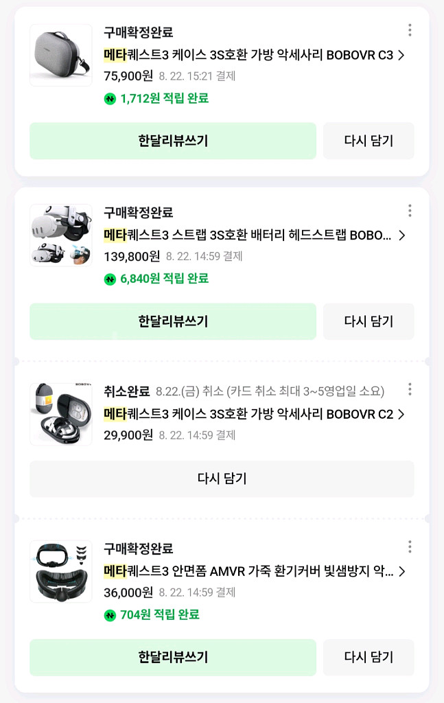 메타퀘스트 3 512gb 이고 구성품 전부 포함 풀박스입니다. 같이 구매한 악세사리 세트로 같이 판매합니다. 구성품 - 메타퀘스트3 512gb 본체 - BOBOVR S3 PRO (쿨링팬 달린 모델) - AMVR 안면폼 - 구성품 모두 호환되는 케이스 - 악세사리 구매하면서 같이 받은 사은품 8월 말에 구매했는데 vr멀미 적응이 안되서 판매합니다. 실사용 5시간 미만이라 거의 새제품이나 마찬가지입니다. 택배 가능하고 직거래 성주에서 가능합니다. 구매하실분 연락주세요.