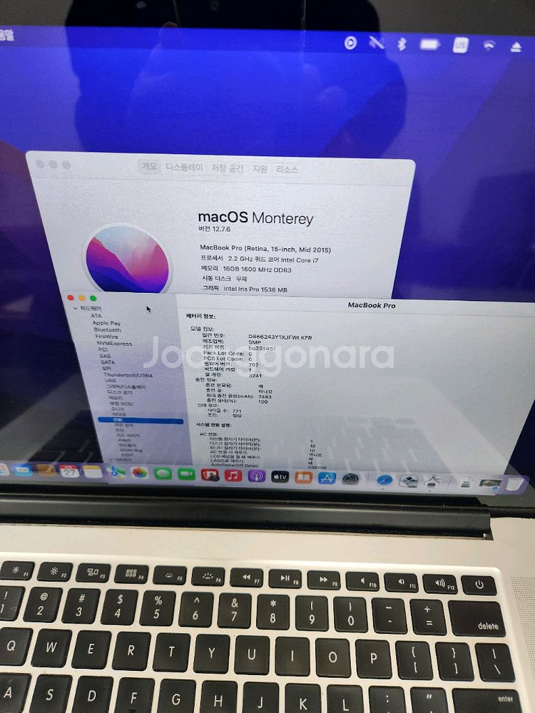 2015년형 맥북프로 15인치 i7 팝니다. Monterey 버전이고 램은 16기가입니다. 안전결제해주시면 됩니다! 맥 os 몬트레이 클린설치 부트캠프 windows 10 64 설치됨 화면에 실기스 있어요 나머지는 정상 작동 합니다 맥북프로 15인치. 전용 85w 충전기 드립니다