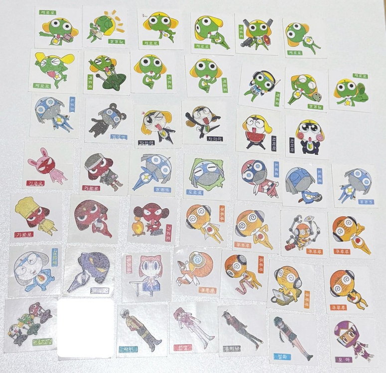 2008-2010년쯤 구매한 단종 구버전 케로로 띠부씰입니다. 총 46개 일괄판매합니다. 중복은 케로로 1개있고 반짝이 5개(도로로2,타마마2,기로로1)있습니다. 상태 좋습니다.
