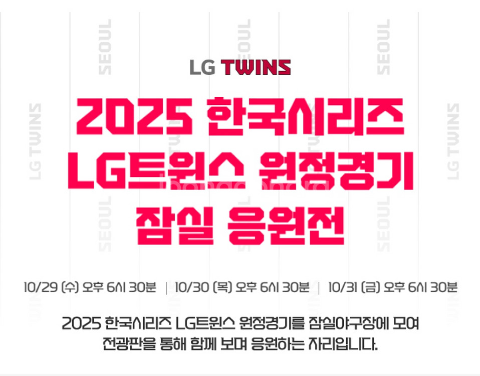 2025년 10월 30일 18시 30분에 진행하는 LG트윈스 원정 응원전 티켓입니다. *3루 블루석 216블록 12열 ***, ***, ***, ***번* 장당 15,000원 모바일티켓으로 전송해드립니다. 상품 정보 내 개인정보는 자동 보호됩니다. 안심결제로 안전하게 거래하세요.