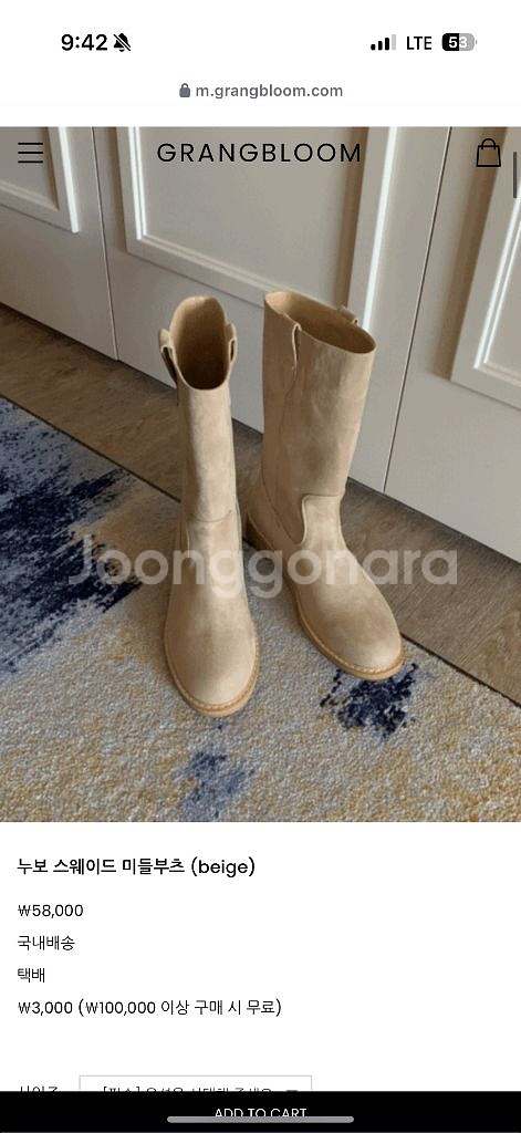 GRANGBLOOM 브랜드의 스웨이드 미들 부츠입니다 색상은 베이지이며, 스웨이드 재질로 되어있습니다 일주일전 구매 현재 사이트 판매중 박스채 그대로 새상품 저 235신는데 타이트 해서 240으로 주문 했어요 택포 드려요