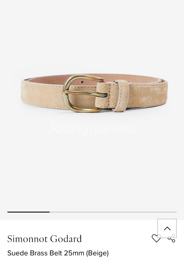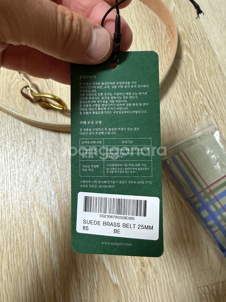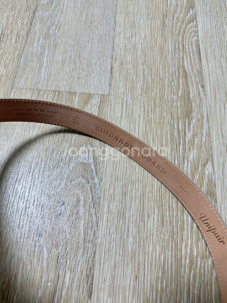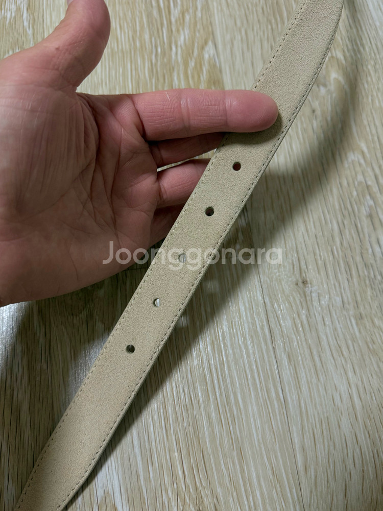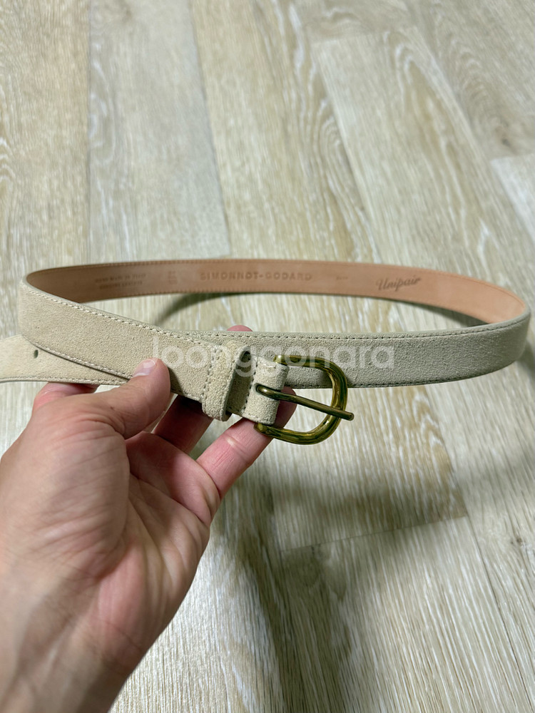시모노 고다 유니페어 스웨이드 벨트 유니페어에서 구매한 시모노 고다 벨트입니다. 사이즈는 85 로 제 기준 허리 30 중간 칸에 채움. 벨트 폭 : 25mm 색상 : 베이지 현재 24만 9천원 판매 중인 모델. 1회 착용 했고 특이사항 없습니다. 홀 늘어짐 등의 흔적도 딱히 보이지 않음.