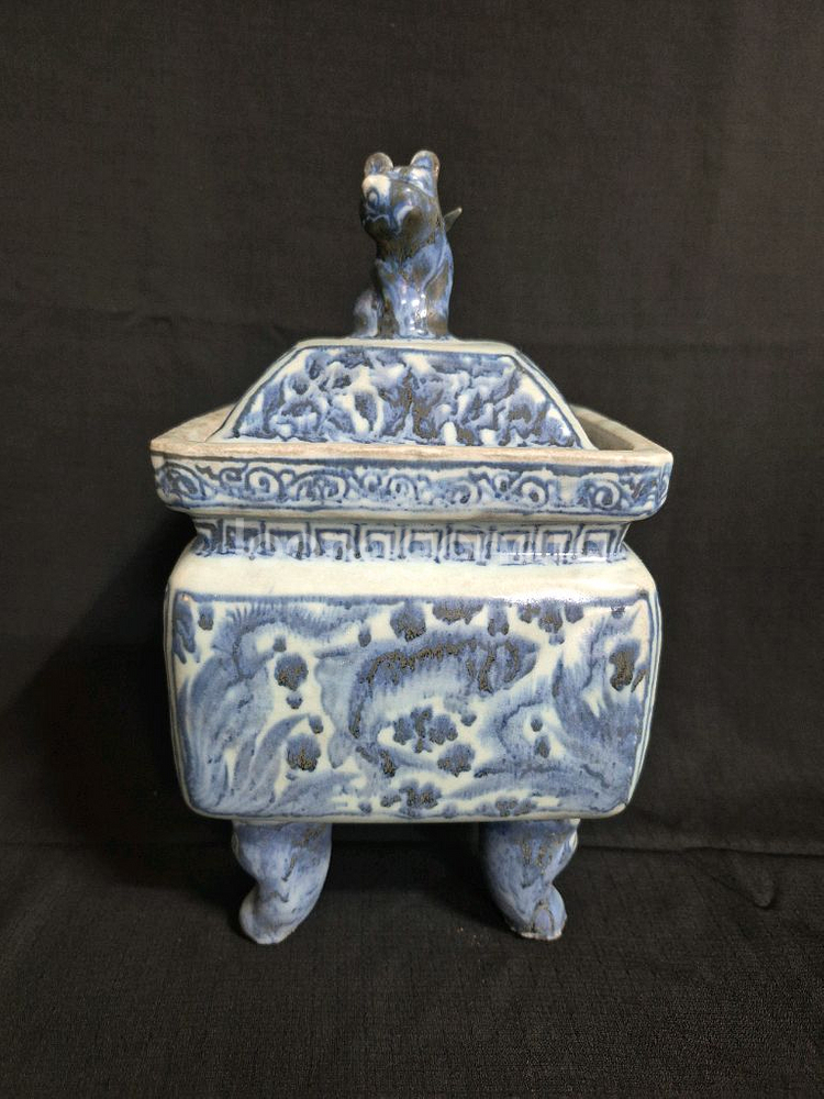 25*14*14cm. 무게가 2.2키로로 무겁고 뽀송한 감촉이 아주 좋습니다. 청화 코발트의 흐르듯이 번짐 현상이 매우 흥미롭지요. 뚜껑에 유약이 묻지 않은 부분이 있지만 고풍스러운 분위기로 느낌이 아주 좋아요. 사족 향로는 매우 드물어요. 연대 작품성 희소성이 잘 느껴지네요. 오래되어 낡았어도 흔하지 않은 귀한 물건은 언젠가 그 가치를 인정받지만 흔하게 보이는 것들은 그렇지 못하지요. 여러 사정으로 가격을 많이 낮춰서 올렸어요. 저렴해도 허접하지 않으니 이런 때 좋은 물건을 찾아 소장하시는 것도 좋겠어요.