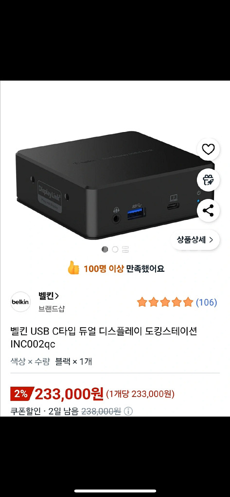 개인정보(거래정보)를 주고받는 행위는 사기에 노출될 수 있으므로 즉시 중고나라로 신고해 주세요벨킨 USB-C 듀얼 디스플레이 독 INC002qc 영상편집이나 HDMI 작업하기 좋습니다. 신품가 230,000원 직거래 경남진주 및 택배거래