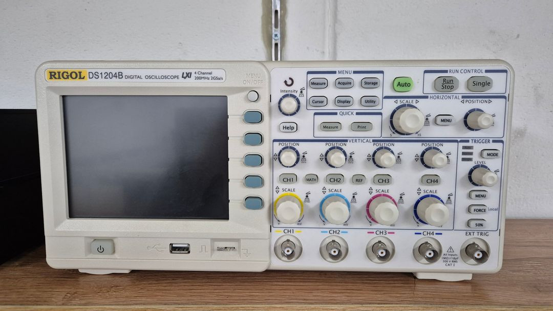 DS1204B 디지털 오실로스코프입니다. 화면과 각종 기능 버튼들이 잘 보이는 상태로 보이며, 전자 측정용으로 사용하기 좋은 제품이에요. 01029999367 신품수준입니다.