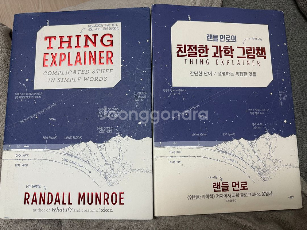 원서와 한글판 두권 같이 판매합니다 보지를 않아서 책상태는 매우 좋아요 『더 위험한 과학책』(원제: Thing Explainer, 랜들 먼로, 2015)은 전작 『위험한 과학책』(What If?)의 후속작이에요. 이번 책은 과학 지식과 복잡한 원리를 아주 단순한 말로 설명하는 것이 특징이에요. 작가가 일부러 “가장 많이 쓰이는 1,000개의 쉬운 영어 단어만 사용해서” 세상의 복잡한 구조를 풀어낸 책이죠. 책은 다양한 과학·기술 주제를 다루며, 대표적인 내용은 다음과 같아요. 우주선 – 복잡한 로켓의 구조와 원리를 ‘우주 가는 큰 배’처럼 설명. 지구의 층 – 맨틀, 외핵, 내핵 등을 ‘뜨거운 돌 속’처럼 단순히 풀이. 핵폭탄 – 위험하지만 중요한 기술을 ‘세상에서 제일 무서운 불꽃 기계’처럼 설명. 사람 세포 – 생명 현상을 ‘작은 기계들이 모여 사는 집’처럼 그림으로 풀이. 원자 구조 – 전자와 원자핵을 ‘작은 공과 그 주위를 도는 점’으로 설명. 국제우주정거장 – ‘하늘 위에서 사람 사는 집’으로 설명.