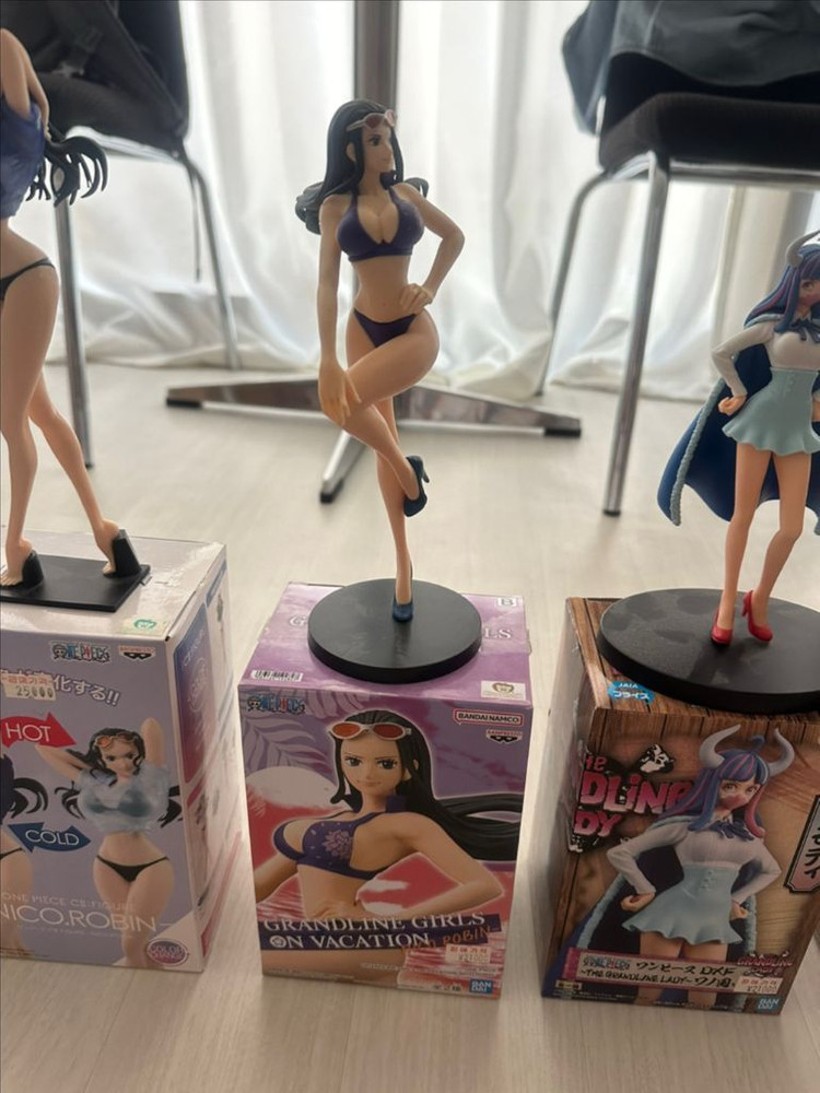 아나키 캐릭터의 섹시한 브라탑 버전 피규어들이에요. 박스와 함께 있어서 컬렉션용으로 좋을 것 같아요. 상태는 양호해 보입니다.