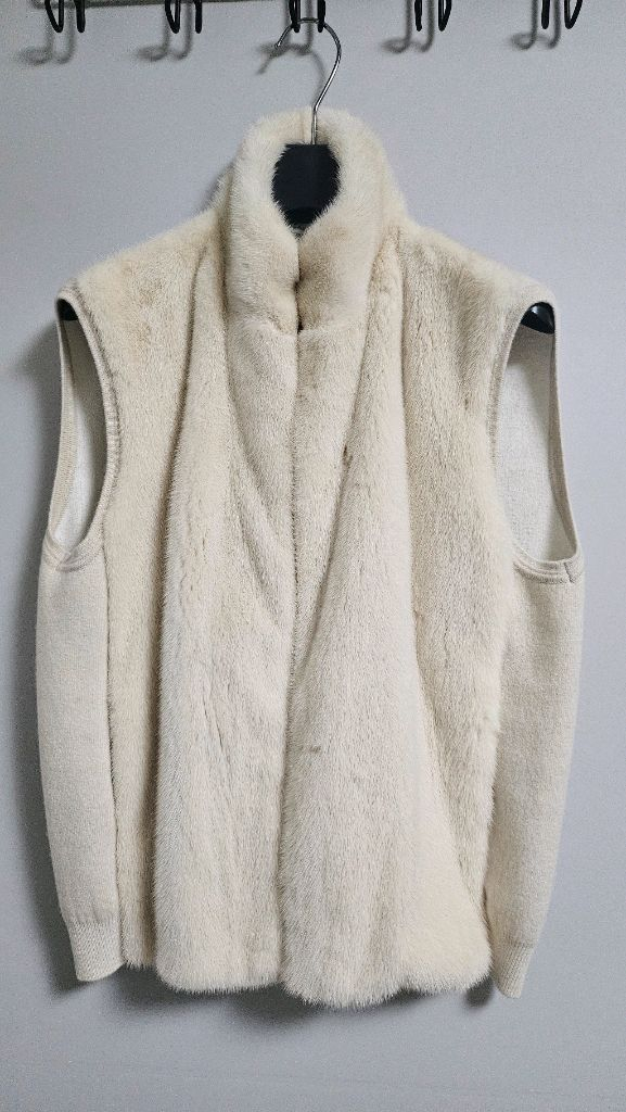 한섬 더캐시미어 천연 밍크 베스트 크림베이지 85사이즈입니다. 지퍼 여밈이고, 캐시미어 혼방 니트 소재라 편하게 입을 수 있어요. 1회 잠깐 입고 보관했고 전체적으로 깨끗하고 상태 좋아요