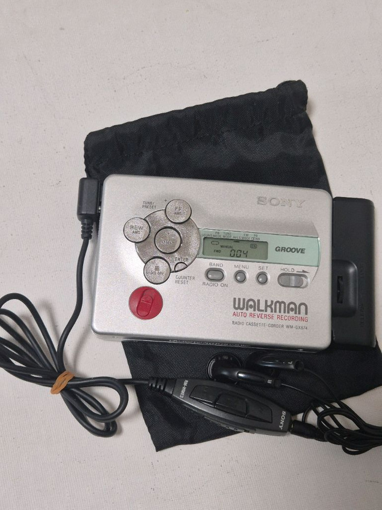 소니 워크맨 WM-GX674 라디오 카세트 녹음 정상작동합니다 외관과 음질도 좋습니다 본체 보조배터리케이스 리모컨 이어폰 파우치