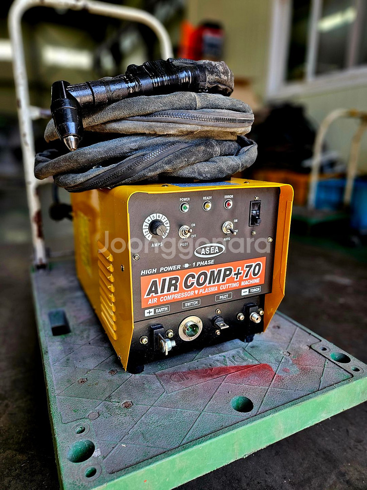 현장에서 몇번 사용안한 깨끗한 국산 프라즈마절단기입니다 국산 아세아 콤프레샤 내장형 제품입니다 콤프내장형으로 따로 콤프레샤 없이 절단이 가능합니다 토치 어스 포함 풀세트입니다 절단 잘됩니다