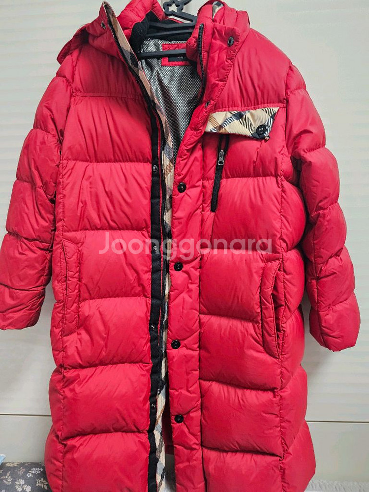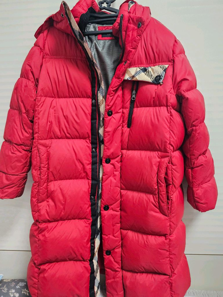레드 컬러의 오리털 롱패딩이에요. 후드가 있고 지퍼와 버튼으로 여밈이 가능하고, 전체적으로 상태 양호합니다. 문의사항 채팅 주세요🥰