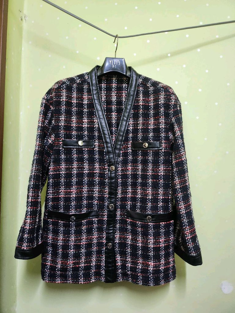 고급스러운 체크 패턴의 트위드 재킷이에요. 블랙 베이스에 핑크와 화이트 체크 무늬가 세련되고, 가죽 포인트 디테일이 포인트입니다. 상태 양호하고 럭셔리한 느낌의 아이템이에요.