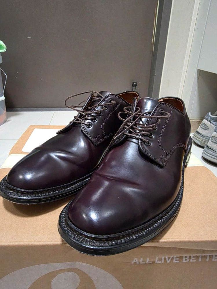 알든7402 샌프란시스코마켓 별주 모델입니다. 톤다운 된 버건디 컬러이며, 990과 같은 색상 입니다. 8.5E(265정도)로 발볼이 여유가 있고, 발등도 높게 구성되어 동양인 발에 잘맞습니다. 올해 2월 대구 샌프란시스코마켓에서 구매했으며, 구매당시 풀구성으로 있고, 실착용은 월 3~4회 정도 하였습니다. 다른 구두들이 많아 점점 실착이 줄어 판매합니다. 특이사항으로는 염색이슈가 있으나 들여다보지않으면 티가 크게 나지않습니다. 대화 3통 이내 거래 시 택포.