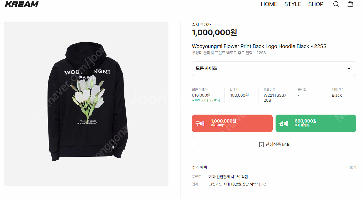 브랜드:우영미 제품명:우영미 플라워 프린트 백로고 후드 블랙 - 22SS 사이즈:50 구입처:우영미 도산점 상태 설명: 보관만 하다가 2번정도 짧은시간 입어 보고는 "도저히 이건 아니다 싶어서" 고가의 명품드라이 완료 후에 보관중 옷 설명: 옷이 굉장히 크게 나왔습니다. 기존 우영미 의류+1 생각하시면 좋을거 같습니다. 50사이즈 기준으로 크림에서 고점찍을땐 100~130 사이에 거래되던 옷입니다 판매가격: 49만원 계좌 문의만 답장 나갑니다. 에눌 등 이상한 연락 보내지 마세요.
