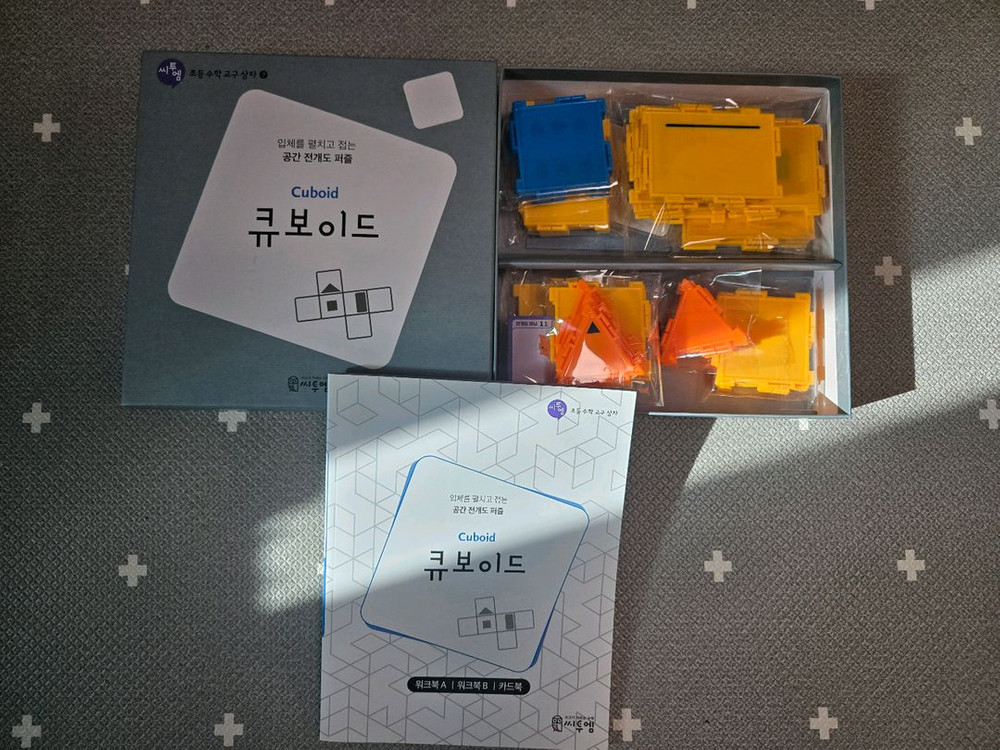 큐보이드 교육용 블록 +워크북 세트입니다. 5-2 전개도 나갈때 공간감각이 필요한 아이들한테 좋아요. 워킹맘이라 자주 못해줘서 상태 양호합니다. (일부는 뜯어보지도 못함) 총 47조각 카드 48장 워크북 전구성 다 있어요. 택포가이니 하실분만 연락주세요~