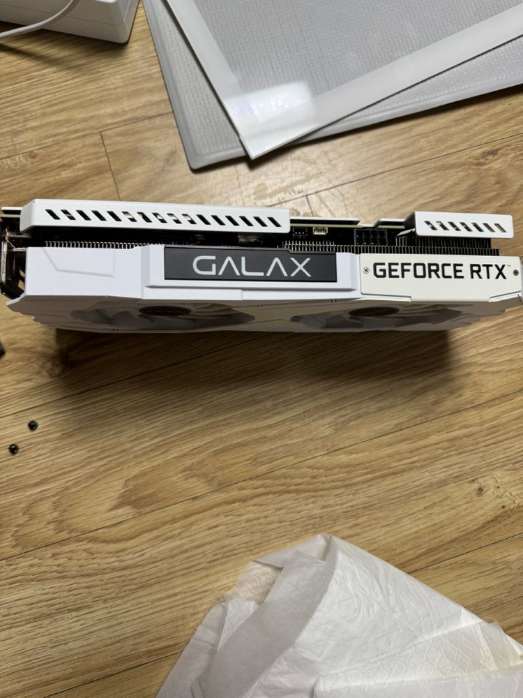 갤럭스 GeForce RTX 3060 그래픽카드입니다. 화이트 컬러로 깔끔하고 상태 양호해 보여요. 게이밍이나 작업용으로 좋은 성능의 그래픽카드예요.