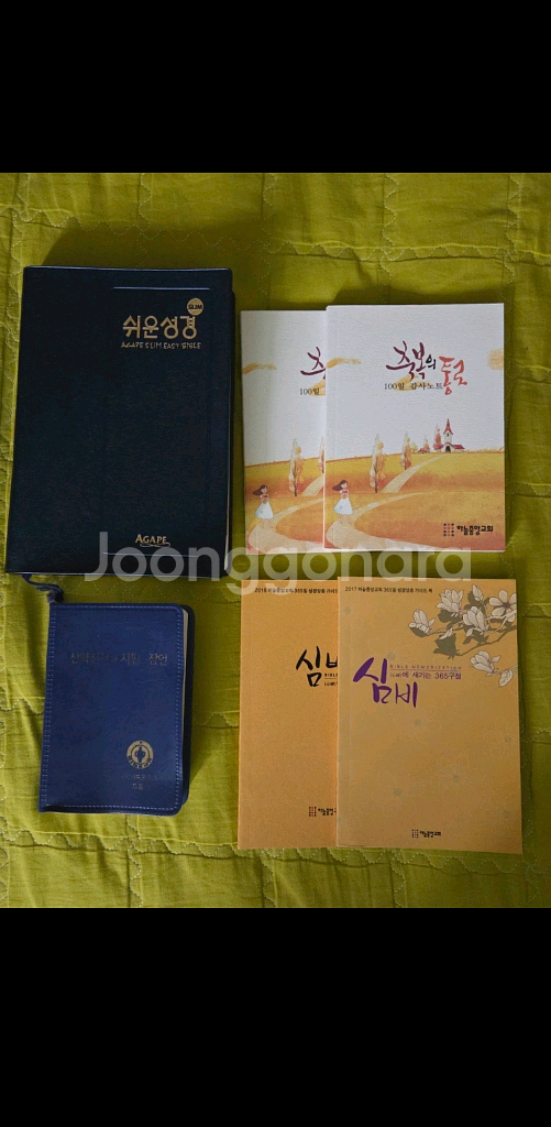 아가페 쉬운 성경 거래하시면 100일 감사노트+365일 성경 암송 가이드북 함께 드립니다. 성경책은 책장에 꽂아놔서 윗부분이 살짝 먼지 쌓인 생활감 있지만 새 것입니다. 신약전서 시편 잠언이 있는 미니 성경도 함께 드릴게요. 작아서 휴대하고 다니며 말씀 읽으면 좋을 것 같아요. CU 알뜰택배 거래합니다.