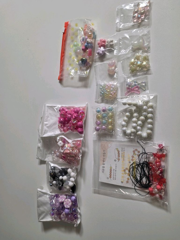 여러 가지 색상과 모양이 예쁜 비즈 세트입니다 - 글라스 비즈와 아크릴 비즈가 섞여 있어요 - 팔찌, 반지, 키링 등 다양한 액세서리를 만들 수 있습니다 위에 4봉지는 키트로 된것 구매 한것이고 나머지는 다 따로따로 낱개 구매한 것들인데 사용하지 않은 새것들 입니다!! 샤론델에서 총 9만원정도 구매 비용 들었어요...