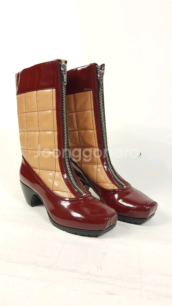 세계적인 명품 브랜드 마크제이콥스의 자주색/베지 누비 에나멜 가죽 여성 미들 부츠입니다. 전통적인 북유럽 나막신 스타일로 앞지퍼의 독특한 디자인입니다. 퍼스트라인 명품 브랜드 답게 최고급 천연 소가죽 소재의 환상적인 이태리 원단입니다. 사이즈는 이태리 37(235 mm) 입니다. 굽높이 5 센티입니다. 매장가 150 만원대의 아주 고가 상품입니다. 이태리에서 직수입한 made in Italy 제품이고요 사용하지 않은 새상품입니다.