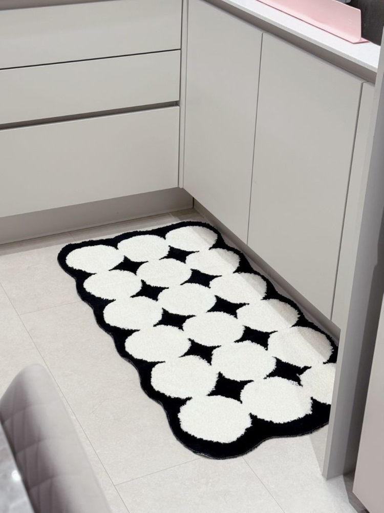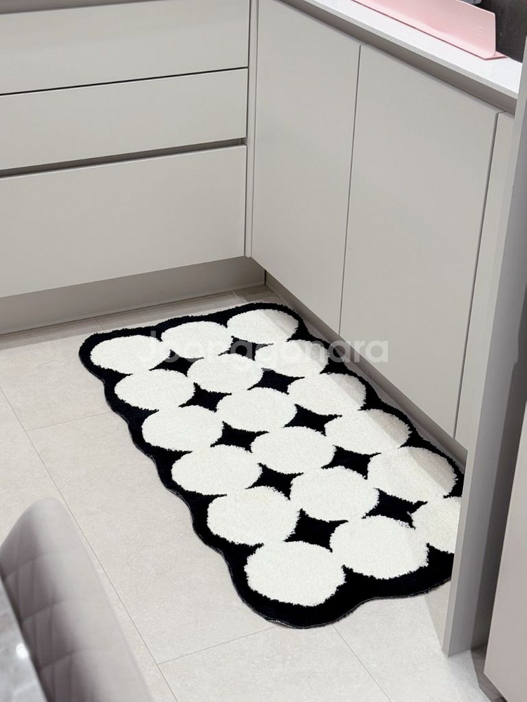 깔끔한 화이트와 블랙 원형 패턴의 러그예요. 거실, 침대 앞이나 주방 바닥에 깔기 좋고, 상태 아주 좋아요 새 제품 입니다.