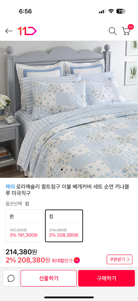로라애슐리 퀼크 침구세트입니다 패드로 사용하셔도 되고 이불로 사용하셔도 됩니다 포함된 품목: 3개 세트 - 킹 퀼트(1개 포함): 96"W(약 244cm) X 104"L(약 265cm) , King Shams(2개 포함): 21"LX 37"W (약 53*94cm) 킹 베개사이즈 커버 2장 포함입니다 (커버만, 베개속통은 아님)