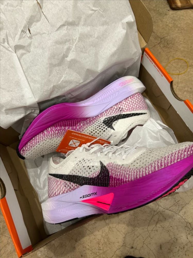 나이키 줌X 베이퍼플라이 넥스트% 3 카본화 러닝화입니다. 사두고 한번도 신지 않았어요.. 현재 250 사이즈는 품절이에요. 박스채 그대로 보내드립니다. (네고x 반품 x) 쇼핑몰에서 판매되는 가격은 화이트 퍼플 런닝화 러닝화 DV4129-104 367,000원 입니다.