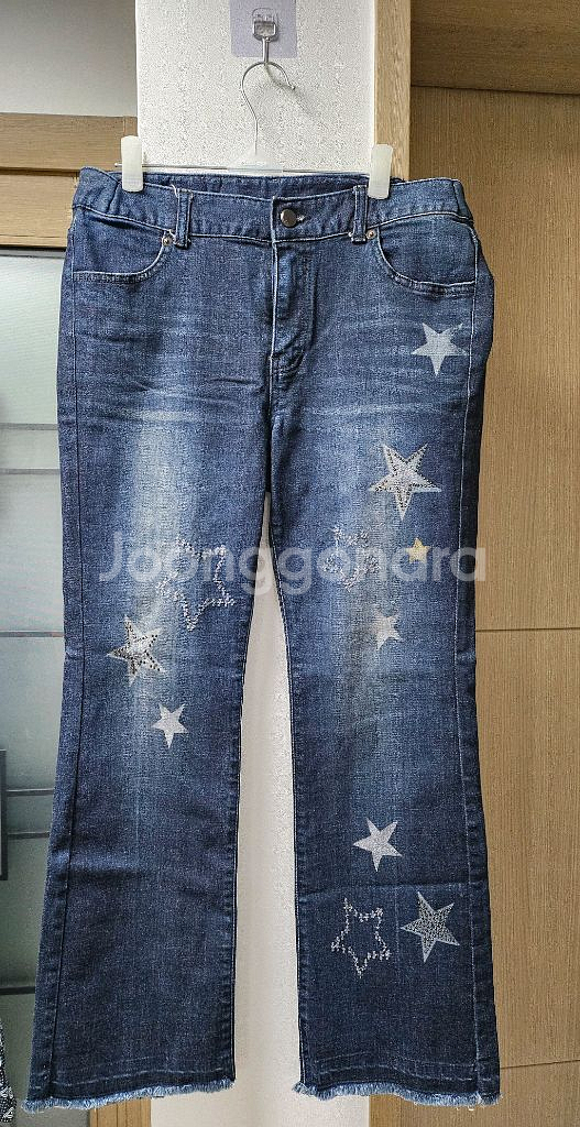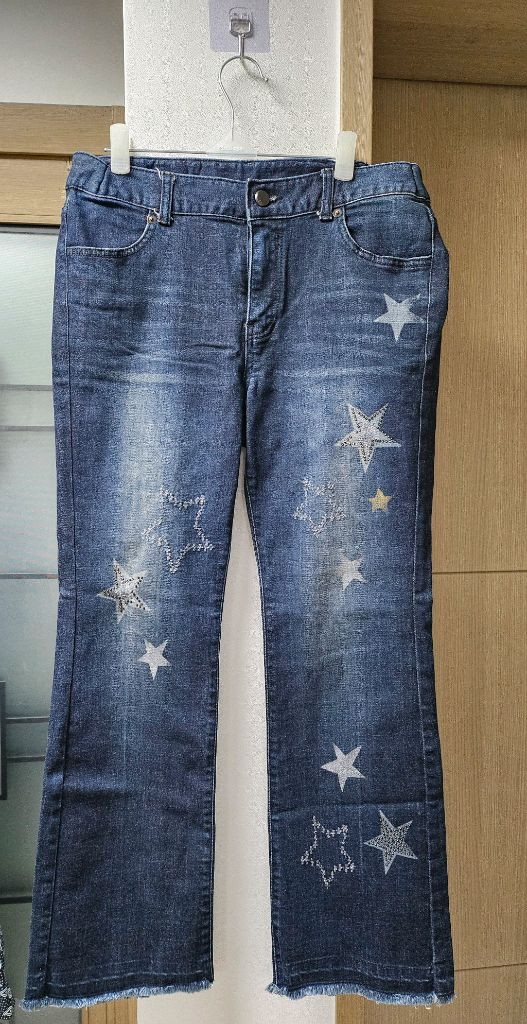 스타 패턴이 들어간 손정완 로스 데님 팬츠예요. 사이즈 77이고 상태 양호합니다. 개성 있는 디자인으로 포인트 아이템으로 활용하기 좋아요. 핏 아주 예뻐요