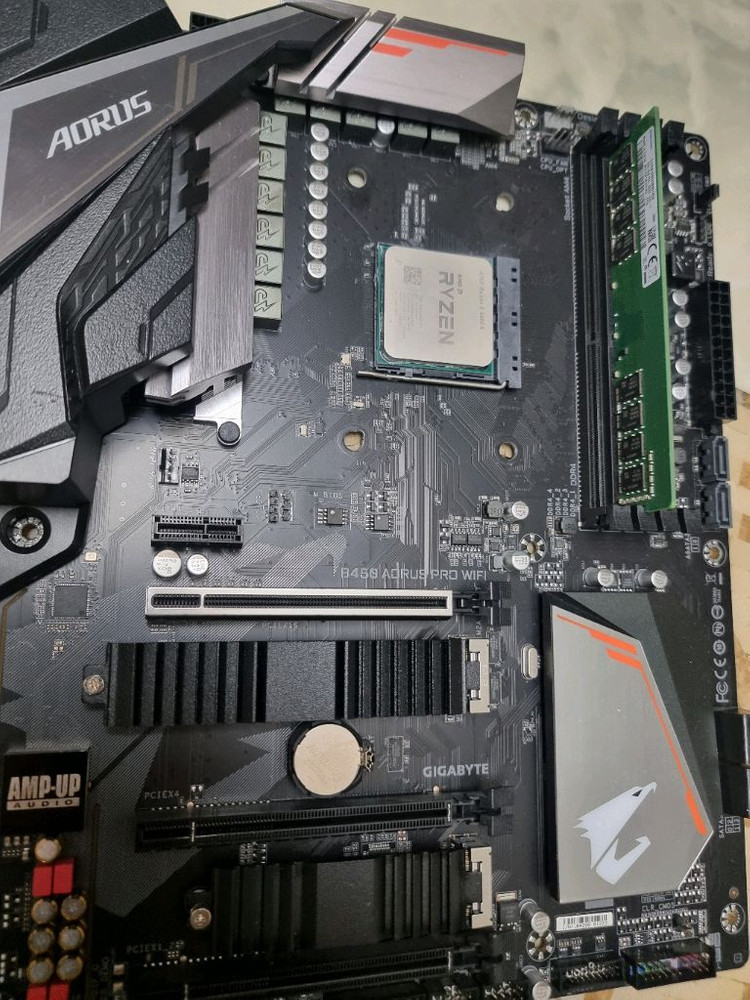 AMD 라이젠 5600X CPU와 어로스 B450 PRO WIFI 메인보드, 삼성 램 8G 가 함께 있는 컴퓨터 부품 세트입니다. 노리턴