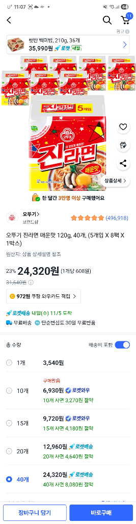오뚜기 진라면 매운맛 40개입 한 박스입니다. 20개 1만원, 40개 2만원에 팝니다. 소비기한 2026.04.13.입니도. 문의 없으시면 바로 안전결제해주시면 됩니다!