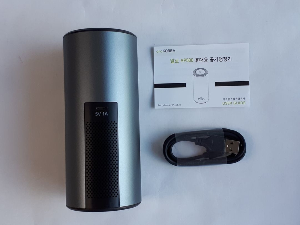 휴대용 공기청정기예요. 박스와 USB 케이블 포함되어 있고 상태 양호합니다. USB 전원으로 간편하게 사용할 수 있어요.