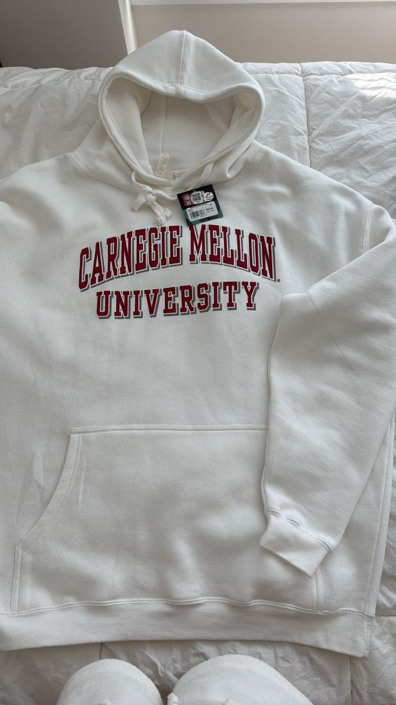 카네기멜론대학교 로고가 새겨진 화이트 컬러 후드티예요! 새 제품 !!!! 깔끔한 디자인으로 캐주얼하게 입기 좋을 것 같아요. XXL