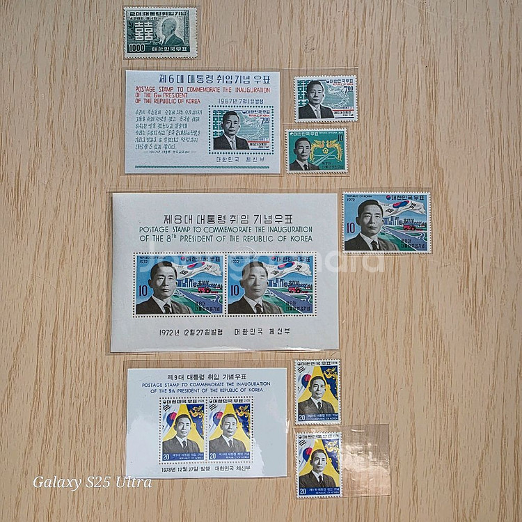 대통령 취임 기념 우표와 은행권이 포함된 수집품입니다. 대통령 우표(박정희, 최규하, 전두환, 노태우, 김영삼)와 옛날돈 일괄로만 판매합니다. 검색해 보시면 저렴하다는 것 아실겁니다.