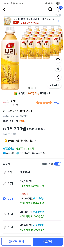 동서 보리차 500ml 20개입입니다. 소비기한은 2026년 8월 25일까지입니다.